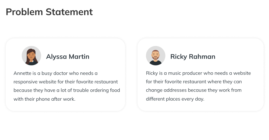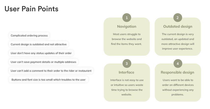 In order to understand the user I created different personas and journey maps. I also conducted interviews and created empathy maps to find user pain points and needs. A primary user group identified through research was people who enjoy food and ordering online since they don’t have much time to cook or go to a restaurant. These are the key insights: