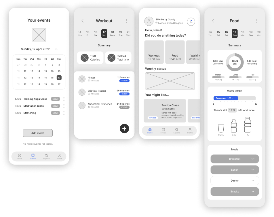 Gym Buddy is accessible to every user and is available on different devices. Users can download our app on their mobile phone and tablet. If they don’t feel comfortable with these screen sizes, users can also use our website version. Gym Buddy offers the same experience and features on every device. I connected all of the screens involved in the primary user flow to create my high-fidelity prototype for the desktop version. Since users already experienced some of the features like Workout, Food, and Water tracking, we decided to simplify the primary user flow for the website desktop version. The primary user flow consisted of: