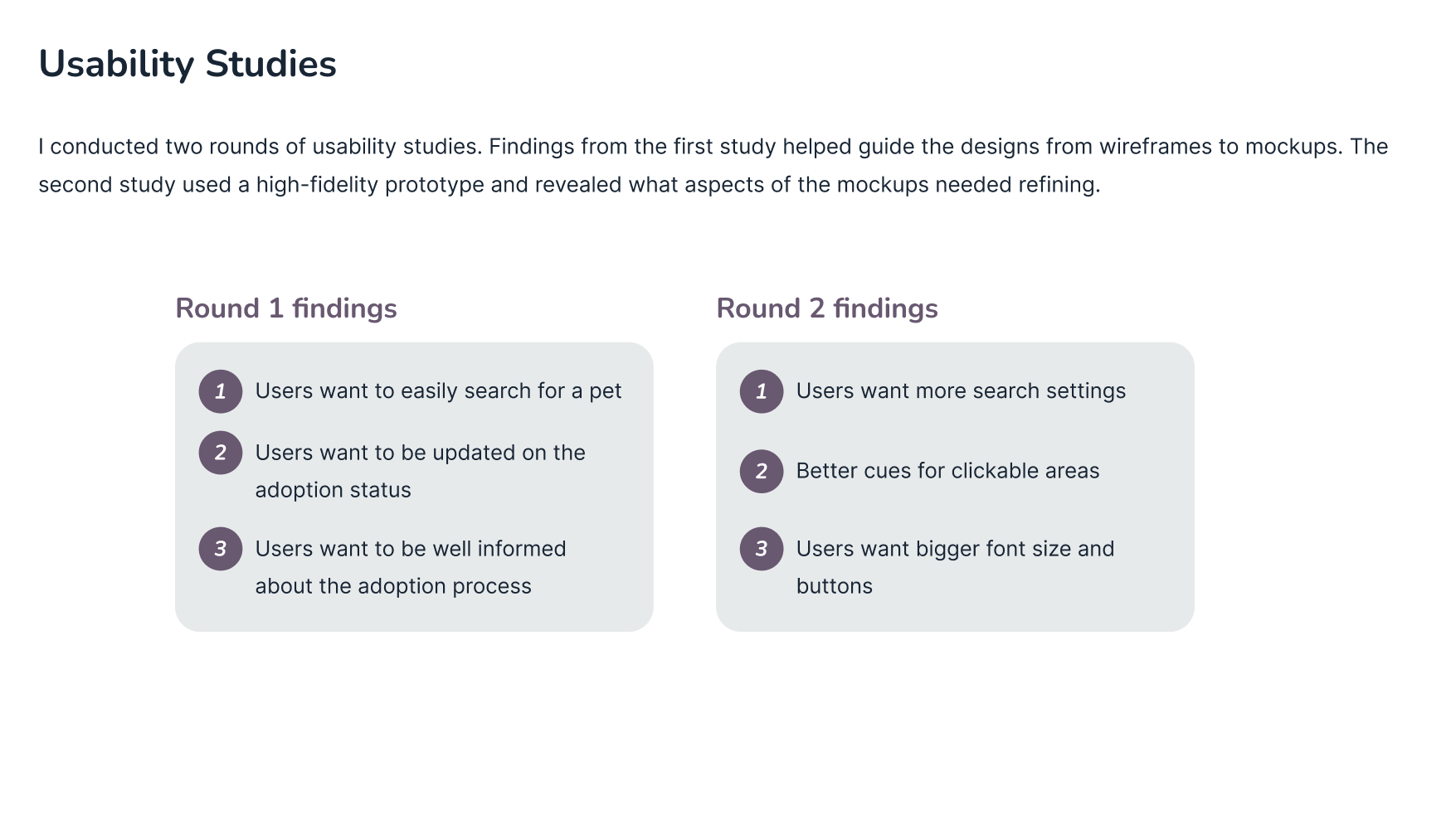 The final high-fidelity prototype presented cleaner user flows for searching for a pet. It also met user needs for a screen for adoption status updates.