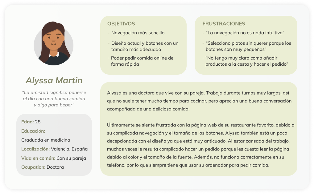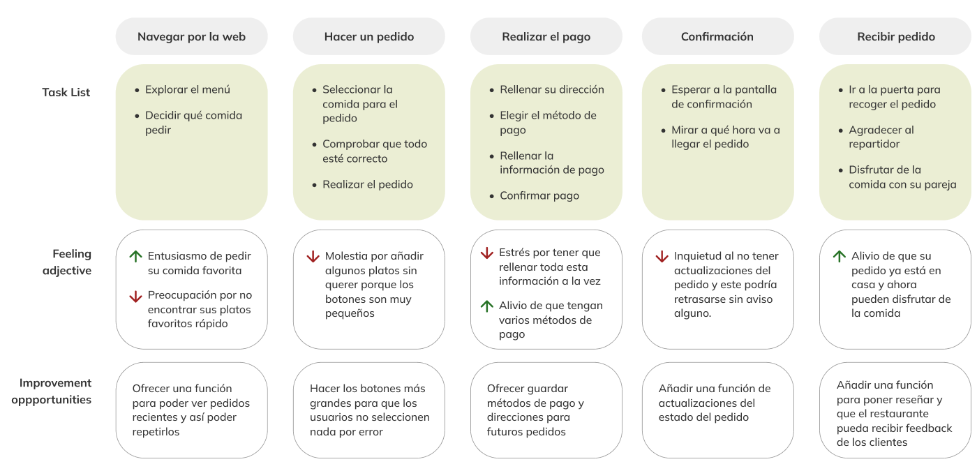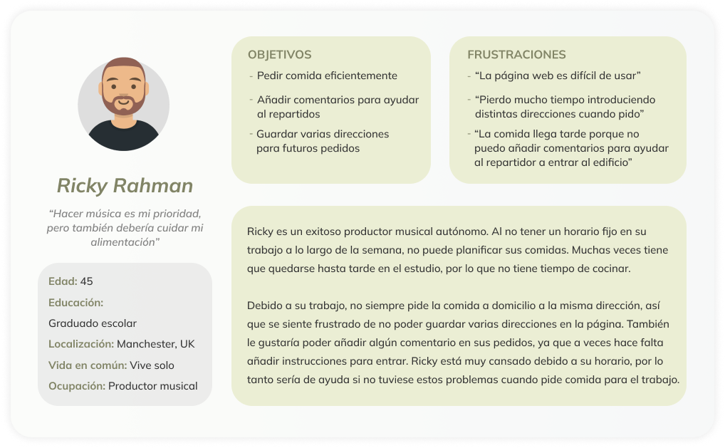 Para entender mejora los usuarios, creé diferentes personas y un journey map. También realicé una serie de entrevistas y creé mapas de empatía para encontrar los puntos débiles y necesidades. Un grupo primario de usuarios identificado durante la búsqueda de información son los usuarios que disfrutan con la comida y pidiendo comida a domicilio online, ya que no tienen mucho tiempo para cocinar ni para ir a un restaurante. Estos son los insights clave: