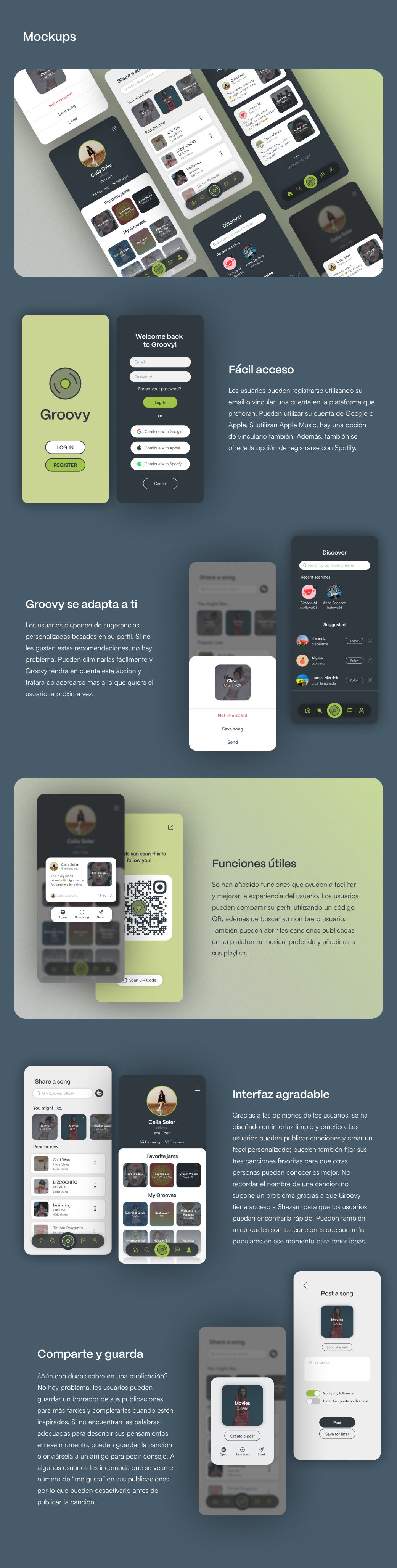 Groovy es una red social en la que los usuarios pueden descubrir y compartir música. Hoy en día a mucha gente le gusta expresarse en las redes sociales. Existen diferentes plataformas en las que se puede compartir imágenes y vídeos, pero a muchos usuarios también les gustaría poder compartir sus canciones favoritas con el mundo y expresar así como se sienten. Mi objetivo es crear una aplicación que resulte familiar a los usuarios, teniendo una interfaz fácil de usar e intuitiva. Groovy tiene todas las funciones que los usuarios necesitan para compartir y descubrir música a diario.