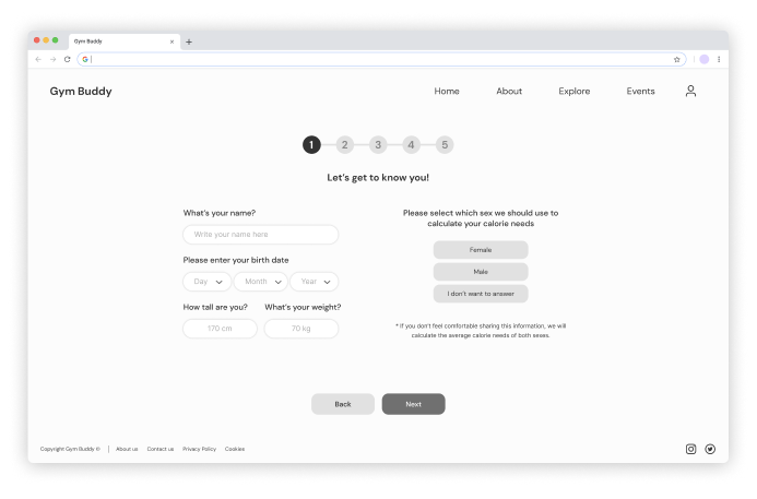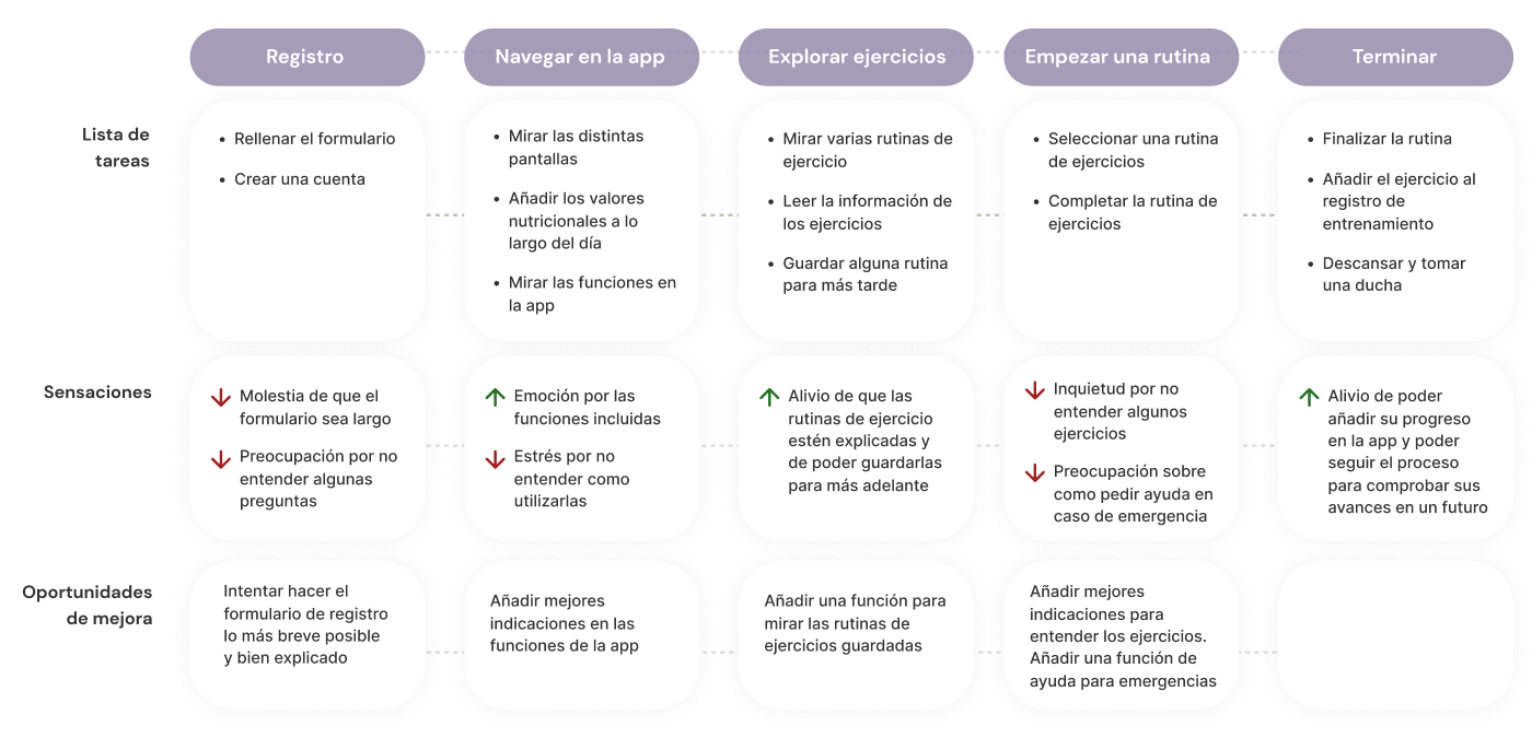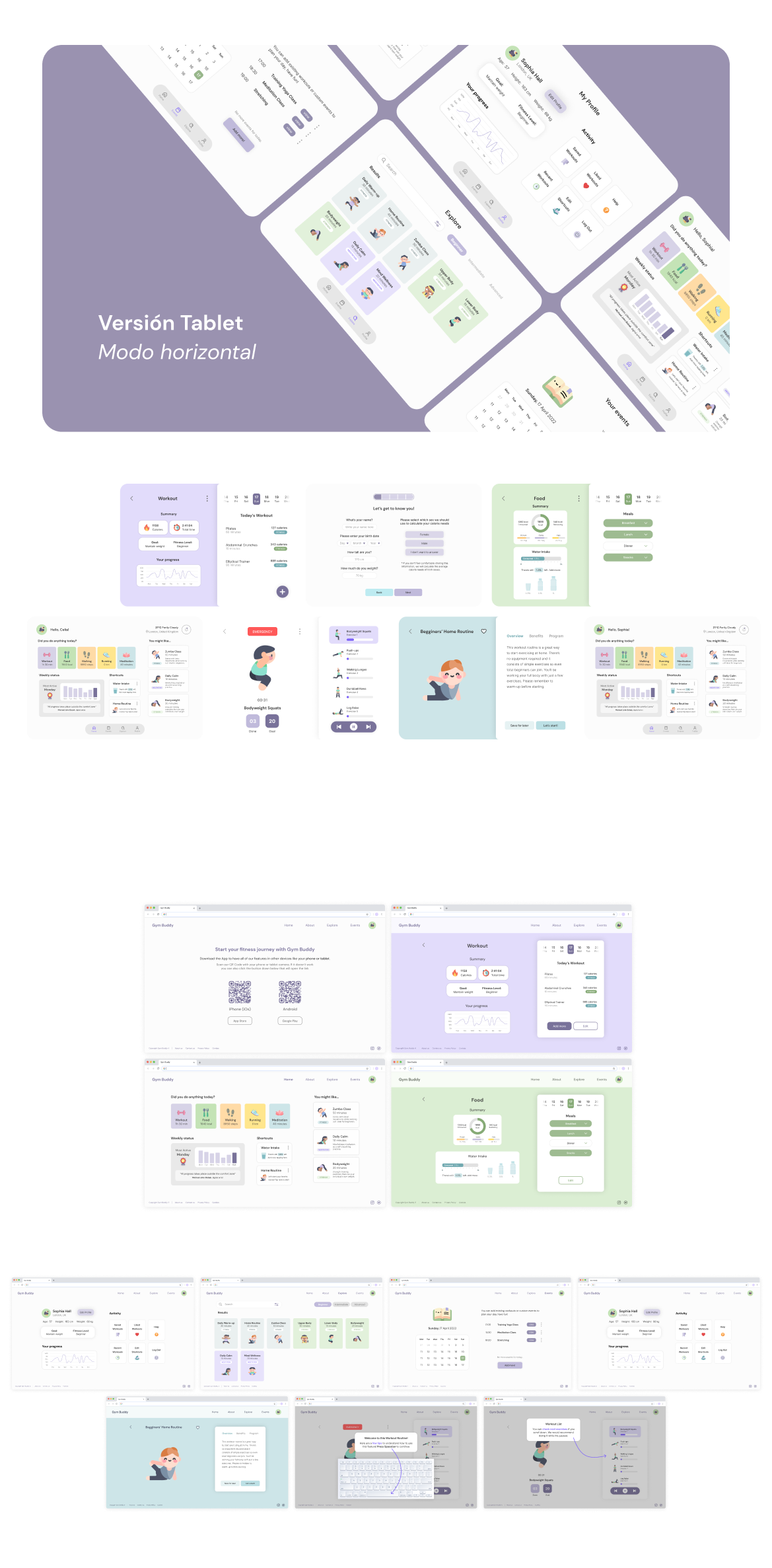 Gym Buddy es accesible para todo el mundo, y por eso mismo está disponible en distintos dispositivos. Los usuarios pueden descargar la aplicación en su teléfono móvil y en su tablet. Si no están a gusto con estos tamaños de pantalla, los usuarios pueden utilizar también la versión web, ya que Gym Buddy ofrece la misma experiencia y funciones en todos los dispositivos. Se conectaron todas las pantallas implicadas en el flujo de uso o user flow primario para crear el prototipo de alta fidelidad. Como los usuarios ya habían probado las funciones en que hay en el registro de entrenamiento, comidas y agua, se decidió simplificar el flujo de uso primario en para la versión de escritorio de la página web en el prototipo de alta fidelidad. El user flow primario consiste en: