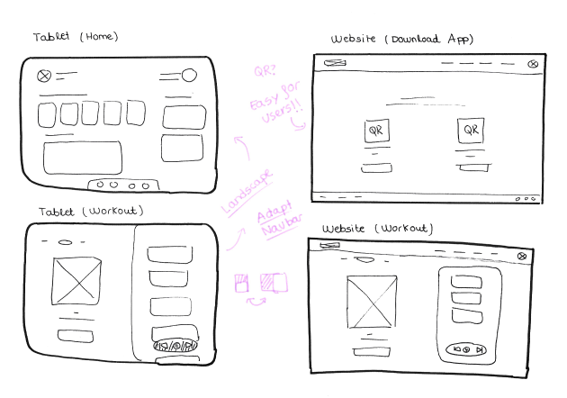 El primer paso en la fase de diseño fue hacer una serie de bocetos en papel de algunas de las pantallas, para así probar las distintas ideas que tenía en mente. Se añadieron algunas anotaciones dibujando una estrella en los detalles que más gustaban, y que posiblemente aparecerían en los wireframes o bocetos digitales.