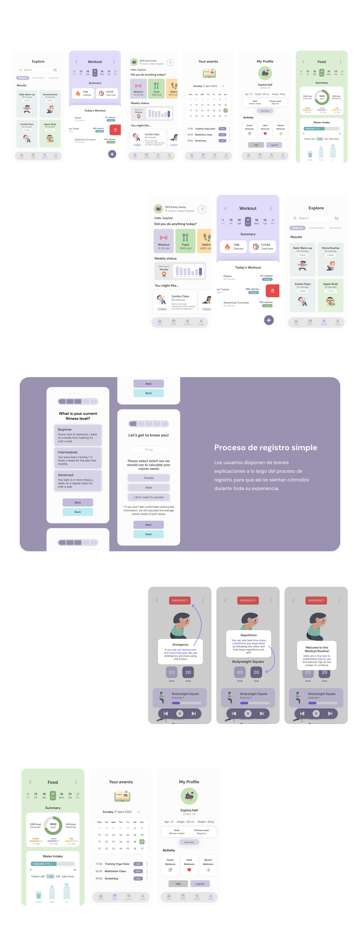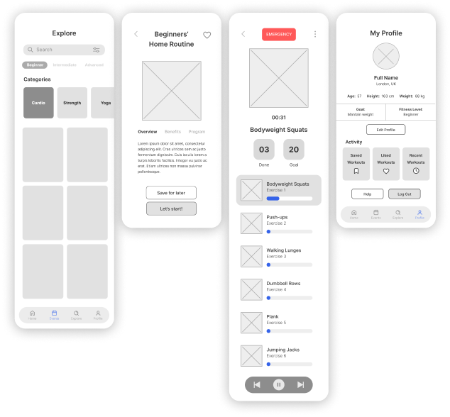 Se conectaron todas las pantallas implicadas en el flujo de uso o user flow primario para crear el prototipo de alta fidelidad. El user flow primario consiste en crear una cuenta, navegar por la aplicación y mirar una rutina de ejercicio. Varios usuarios probaron este prototipo en un estudio de usabilidad para ayudar a mejorar los diseños.