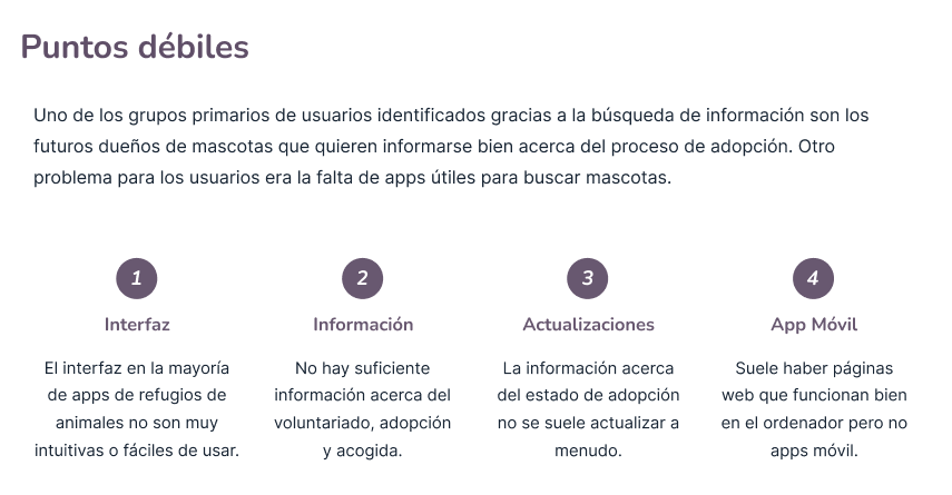 Se priorizó poder buscar de forma rápida y sencilla mascotas y encontrar consejos útiles para el usuario. A medida que esta fase de diseño inicial continuaba, fue prioridad que estos diseños se basaban en los comentarios obtenidos de la información obtenida previamente acerca de los usuarios. El diseño de una pantalla en la que se pueda ver todas las actualizaciones en el proceso de adopción fue clave para abordar la principal necesidad de los usuarios.